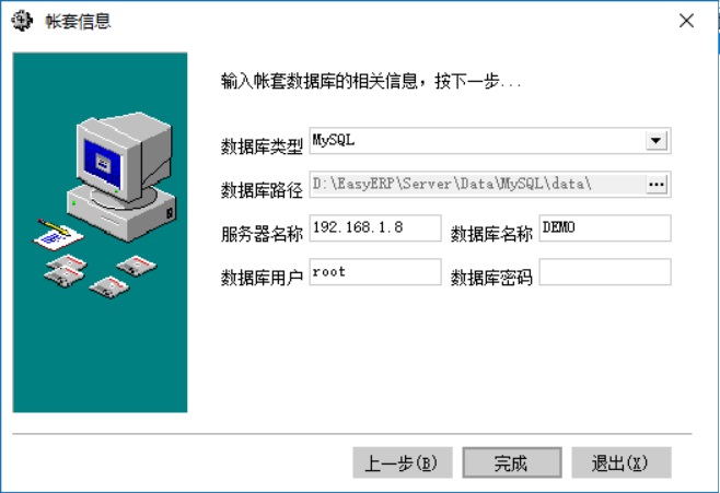 输入服务器IP、数据库名称、数据库用户和数据库密码后,点击“完成”,稍等几分钟即可完成创建新建帐套。