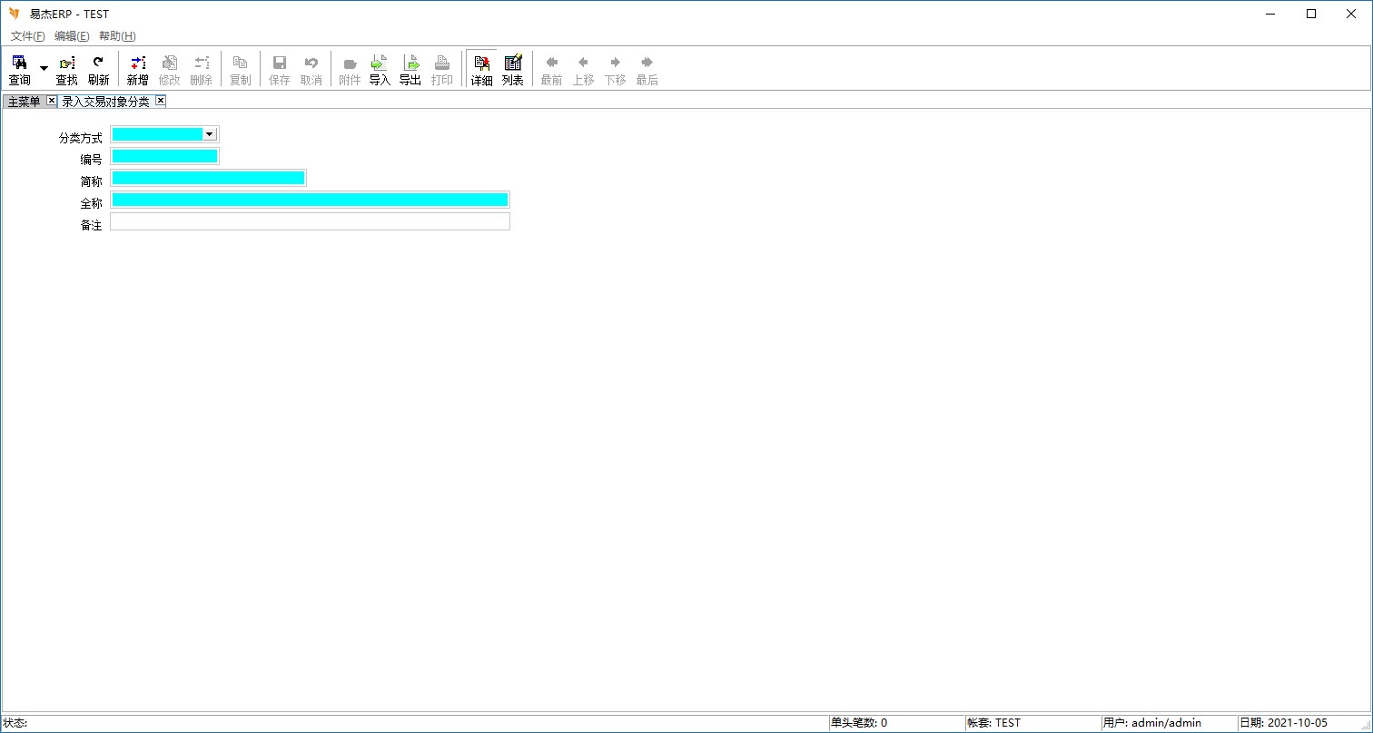 树状主菜单中选择 系统管理子系统->基础设置->录入交易对象分类,出现如下画面: