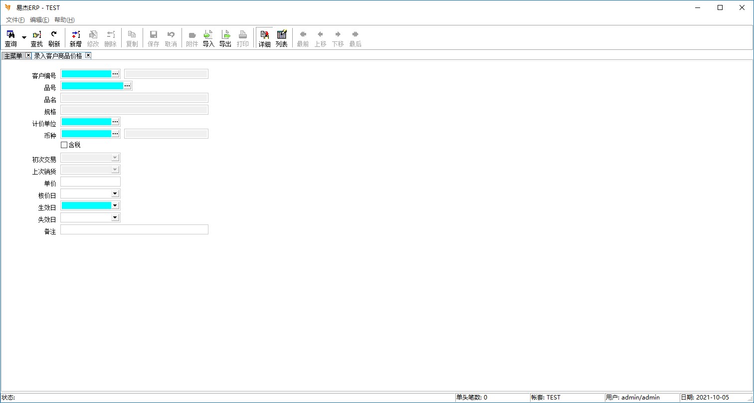 树状主菜单中选择 销售管理子系统->客户管理->录入客户商品价格,出现如下画面: