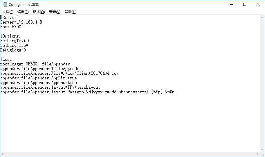 设置Server=服务器IP地址 (此例中服务器的IP地址为192.168.1.8) 其余不要变动,保存后退出
