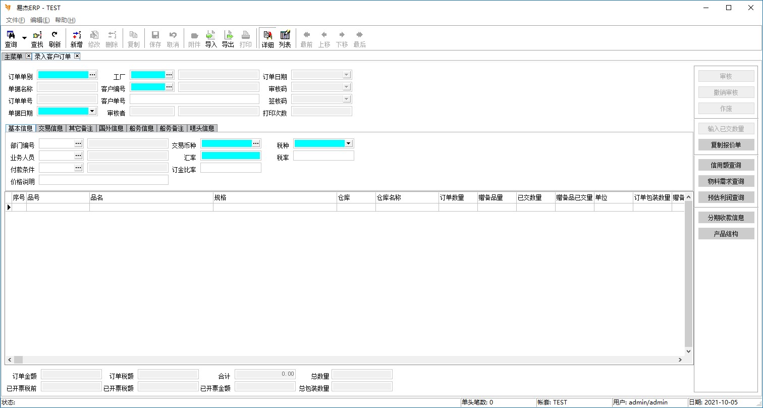树状主菜单中选择 销售管理子系统->订单管理->录入客户订单,出现如下画面: