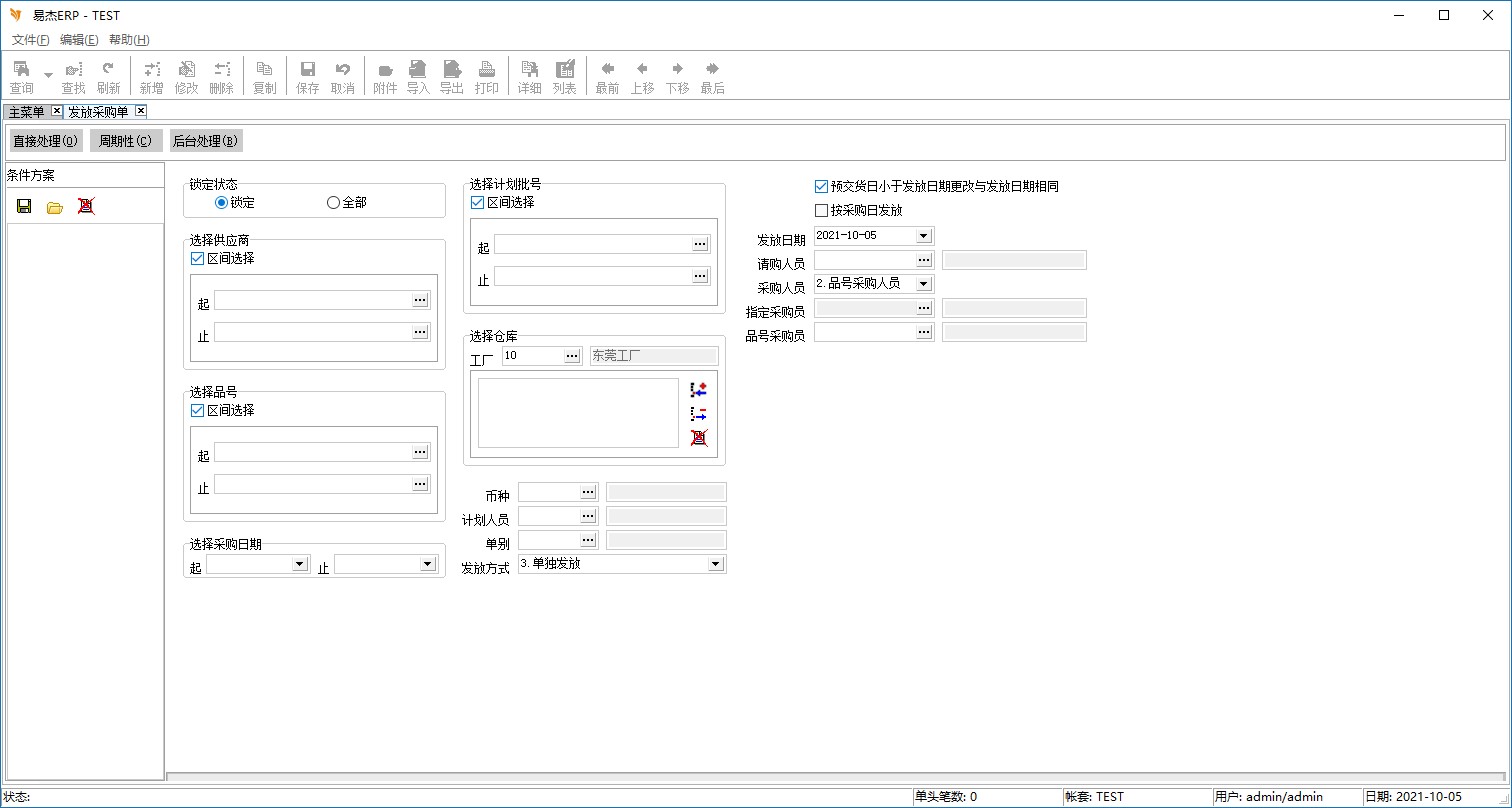 树状主菜单中选择 批次需求子系统->采购计划->发放采购单,出现如下画面: