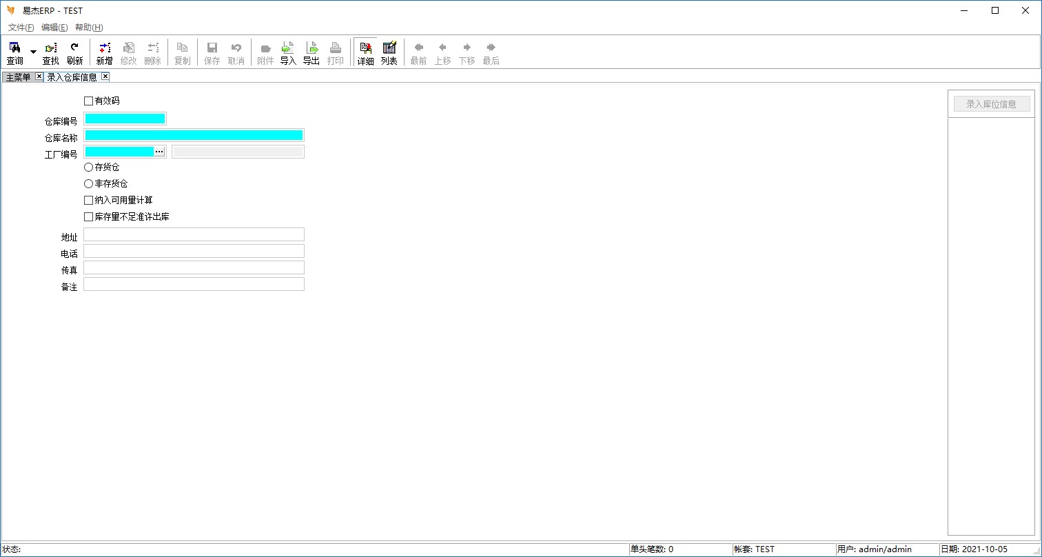 树状主菜单中选择 系统管理子系统->基础设置->录入仓库信息,出现如下画面: